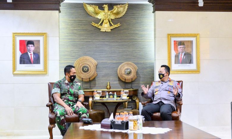 Jakarta, Oke Jatim - Panglima TNI Jenderal Andika Perkasa menyambangi Kapolri Jenderal Listyo Sigit Prabowo di Mabes Polri, Jakarta Selatan, Selasa (23/11/2021). Dalam kesempatan itu, kedua Jenderal tersebut salah satunya membahas soal ditingkatkannya sinergitas dan soliditas TNI-Polri.