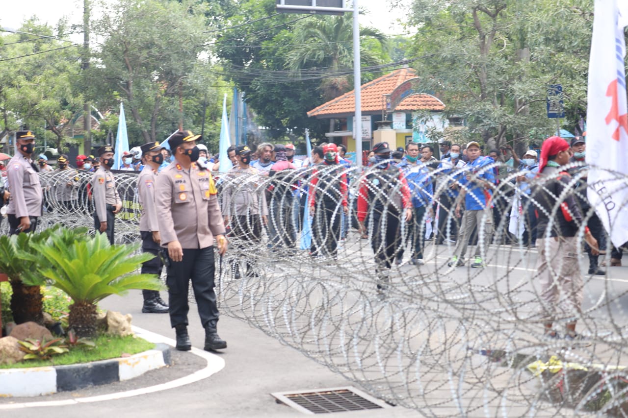 Mojokerto, Oke Jatim - Bertempat di depan Kantor Bupati Mojokerto, Kapolres Mojokerto AKBP Apip Ginanjar memimpin pelaksanaan pengamanan aksi unras oleh Aliansi Perjuangan Buruh Mojokerto (KC. FSPMI Kabupaten Mojokerto dan DPC K.SPSI Kabupaten Mojokerto), Kamis (25/11) pagi. Beberapa tuntutan disampaikan dalam aksi unras ini, diantaranya tuntutan kenaikan UMK 2022 Kabupaten Mojokerto, penolakan terhadap UU No. 11 Tahun 2020, dan penolakan PP No.36 Tahun 2021.