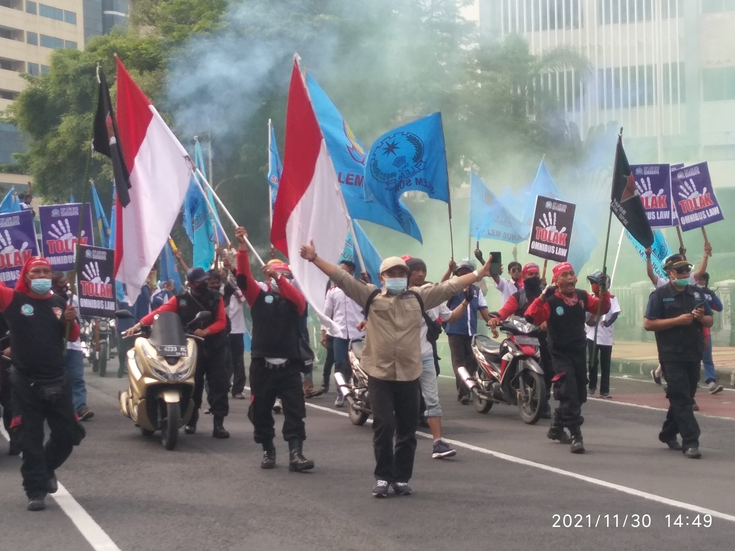 Surabaya, Oke Jatim - Ribuan buruh kembali berdatangan menuju Gedung Negara Grahadi dan kantor Gubernur Jatim. Melalui Jalan Wonokromo dan Darmo, kawasan tersebut mengalami macet panjang.
